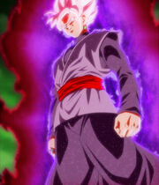 In the anime, Black first revealed Super Saiyan Rosé in his battle against Vegeta, Goku, and Future Trunks. Black was assaulted by Vegeta as a Super Saiyan Blue and withstood his vicious assault before ultimately impaling him through the chest with his energy blade. He then fought against Goku when he transformed into a Super Saiyan Blue; Goku was able to hold his own, but Black used his energy blade to pressure Goku. Once his ally Future Zamasu held down Goku and Trunks long enough, Black was able to take them both down with a single blast of the Super Black Kamehameha, which the Saiyans barely survived. In the Super manga, Goku Black attains this form by combining his divine power and his regular Super Saiyan form into it: by powering up massively due to recovering (and having Future Zamasu heal the damage) from a near-death experience, Goku Black's ordinary Super Saiyan form powered up and then evolved into the Super Saiyan Rosé.